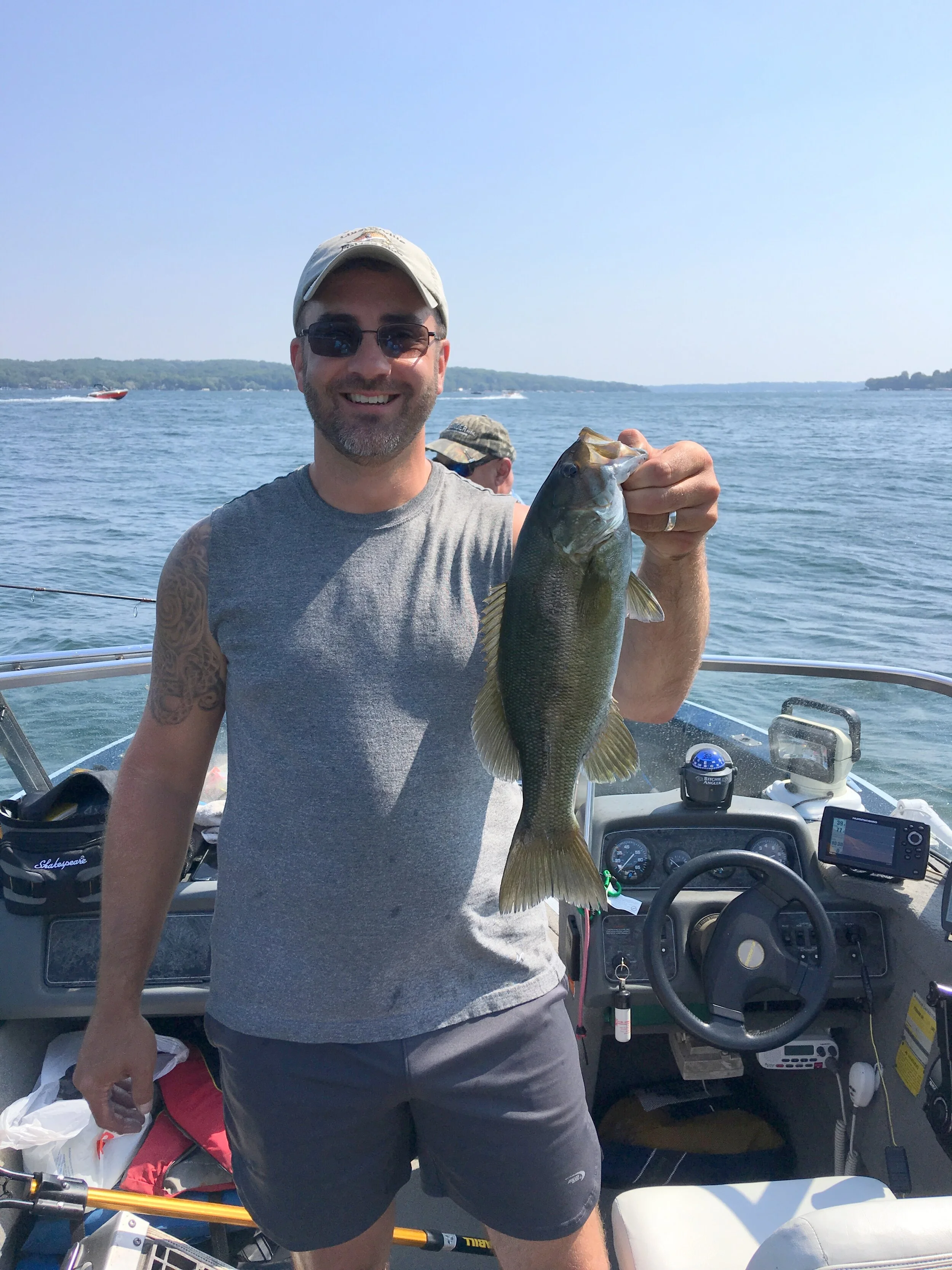Ten members and 1 guest fished Lake Geneva for this outing. The weather was overcast and pretty windy, which made boat control difficult. Nail worms and wacky rigs took bass, while live bait took panfish. The key was depth—you had to stay in 10-14 fow for the best action. The big fish species was smallmouth bass, and Jason Cashmore caught a 15-incher to win it. We totaled 101 points on the following fish:
